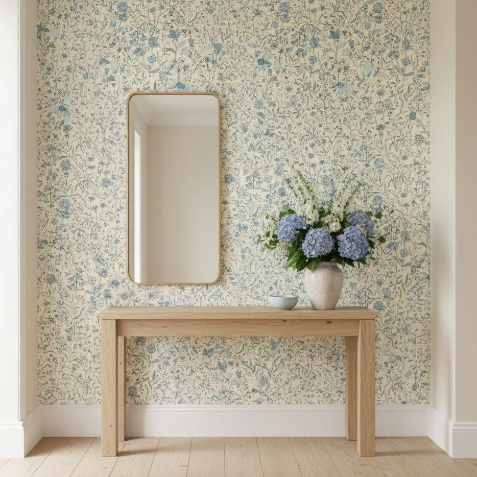 Răspuns: Contrar așteptărilor, modelul floral dens poate amplifica vizual spațiul unei camere mici prin crearea unei profunzimi vizuale stratificate. Secretul constă în aplicarea pe un singur perete focal, de preferință cel opus ferestrei pentru a capta lumina naturală. Paleta de culori deschise – crem și albastru pal – menține luminozitatea, în timp ce detaliile fine atrag privirea și creează iluzia unui spațiu mai mare. Pentru camere sub 12 mp, limitați aplicarea la peretele din spatele patului sau canapelei.