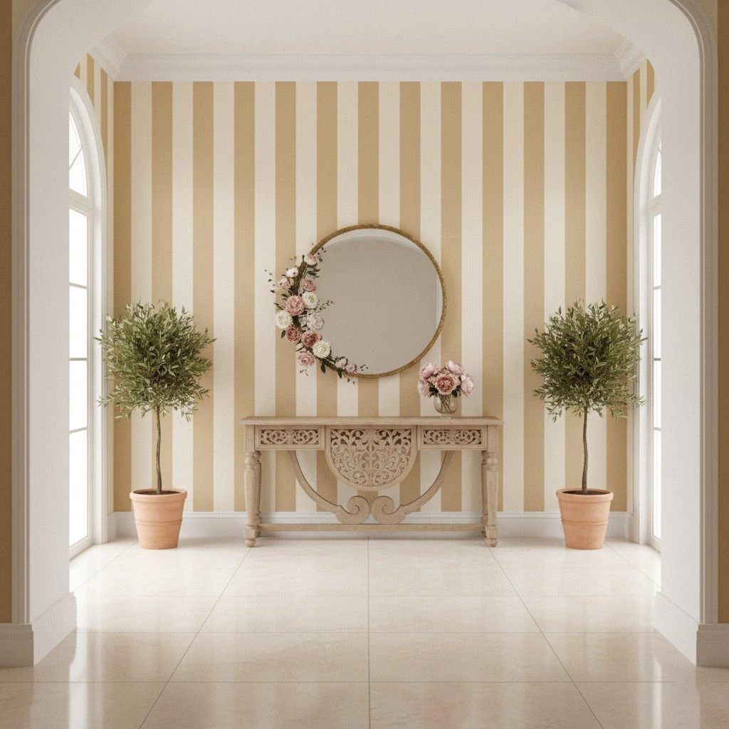 În tendințele de design interior din ultimii ani, dungile verticale au revenit în forță, fiind apreciate pentru capacitatea lor de a crea iluzia unor pereți mai înalți și a unor spații mai ample. Modelul Moutarde 104042235 de la Caselio se aliniază perfect acestui curent, propunând o alternanță echilibrată de dungi late, într-o nuanță caldă de galben muștar și un crem discret, ce amintește de textura inului natural.