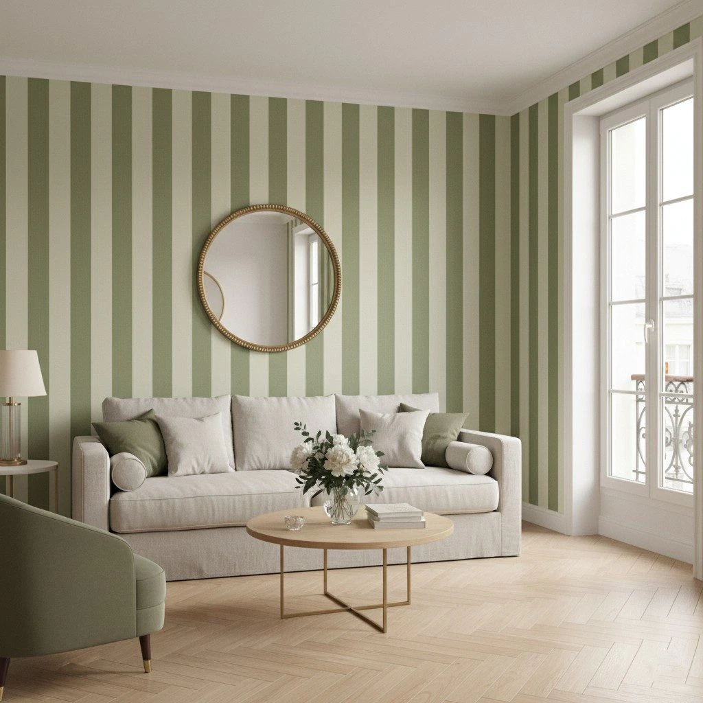 Deși nuanța de kaki este una saturată, designul tapetului include dungi late de culoare crem, care aduc luminozitate și echilibru. Mai mult, dungile verticale au un efect optic de înălțare a spațiului. Pentru un impact optim, poți alege să aplici tapetul pe un singur perete de accent, lăsând restul pereților într-o culoare deschisă, pentru a crea profunzime fără a supraîncărca vizual încăperea.