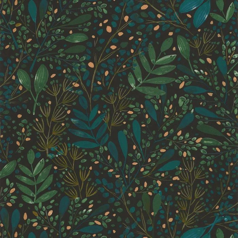 Caracteristici tapet vinil pe suport vlies negru cu frunze dese și accente cupru