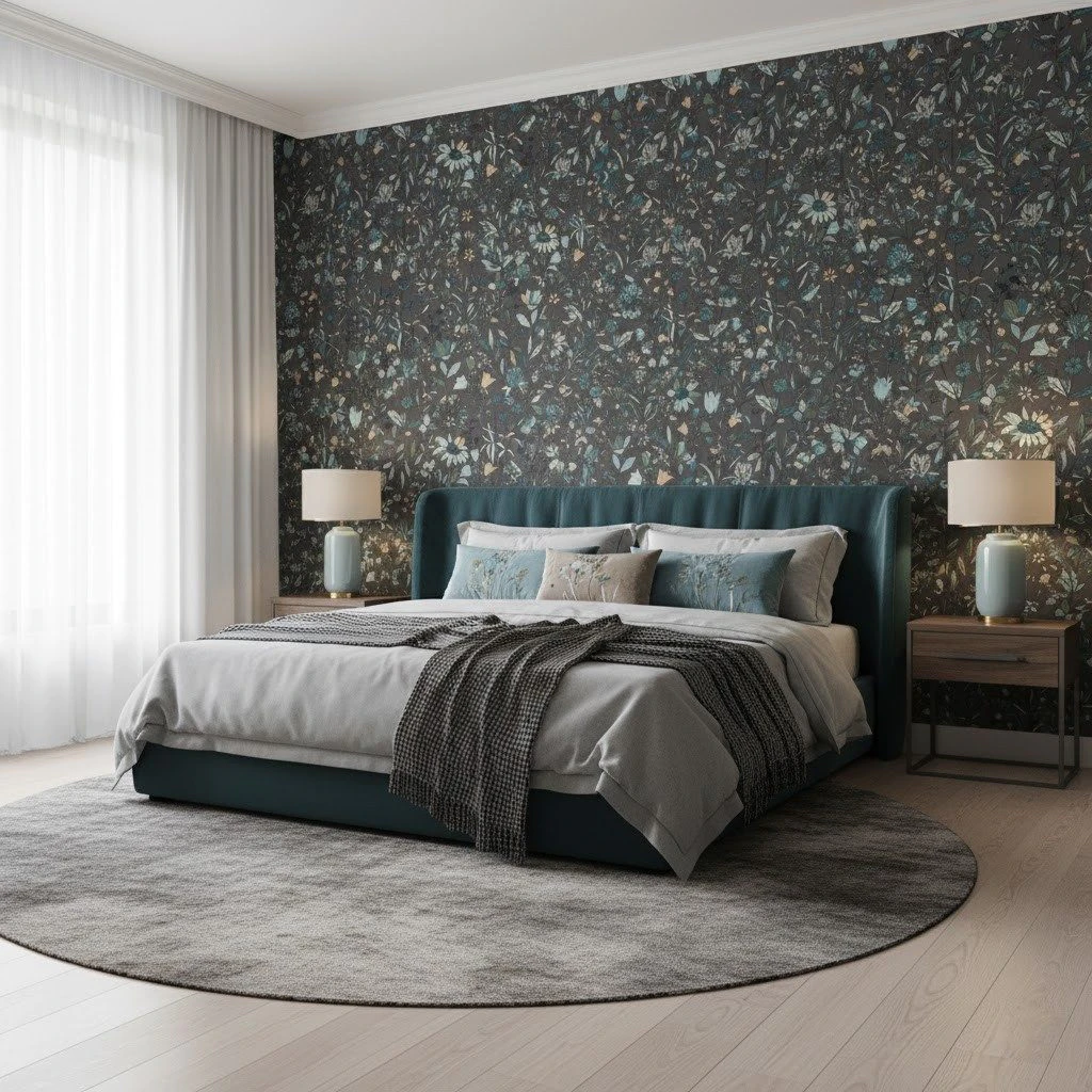 Tapetul vinil pe suport non-woven gri-carbon cu motiv floral botanic multicolor din colecția Jardin de Giverny de la Caselio este o soluție decorativă ce îmbină estetica sofisticată cu funcționalitatea modernă, proiectată pentru a înfrumuseța spații precum livinguri, dormitoare sau holuri. Acest model de tapet cu flori de câmp stilizate în nuanțe de verde, albastru și ocru pe un fundal profund, de un gri-carbon intens, transformă orice perete într-un punct de atracție vizuală, plin de caracter și profunzime. Conform standardelor actuale de design interior, unde natura este adusă în casă într-o manieră artistică, acest tapet răspunde nevoii de a crea un ambient personalizat și reconfortant. Realizat din vinil pe un suport de material non-woven (vlies), acesta oferă o bună rezistență la uzură și permite o curățare eficientă, fiind o alegere practică pentru locuințele moderne din România.