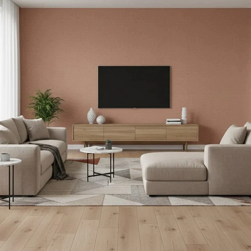 Textura sa fină, care imită o țesătură naturală, adaugă un strat de complexitate vizuală și tactilă, transformând un perete simplu într-un punct de atracție. Spre deosebire de un finisaj neted, acest tapet maschează micile imperfecțiuni ale peretelui și aduce o senzație de confort. Culoarea sa pământie, o nuanță bogată de teracotă, este în tendințele actuale de design interior, creând o atmosferă primitoare, potrivită pentru stiluri de la modern și minimalist la rustic sau boem.