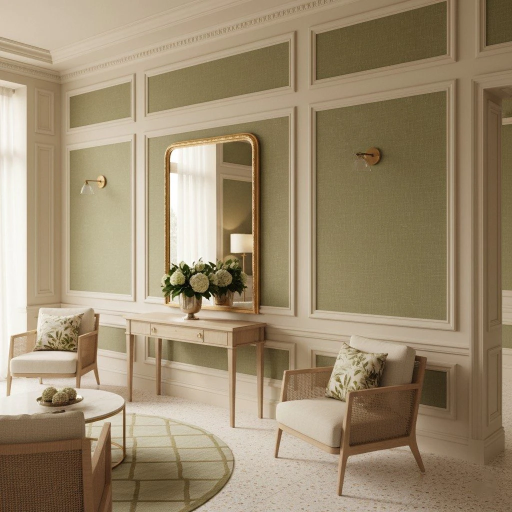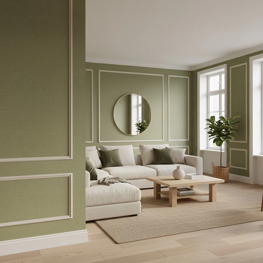 Spre deosebire de un perete zugrăvit într-o singură culoare, tapetul Vert kaki adaugă o dimensiune nouă spațiului prin jocul subtil de nuanțe și textura sa bogată. Fibrele simulate în culori diferite creează un efect vizual dinamic, care maschează micile imperfecțiuni ale peretelui și adaugă o notă de confort. Este o bază excelentă pentru a pune în valoare mobilierul din lemn masiv, decorațiunile metalice sau textilele naturale.