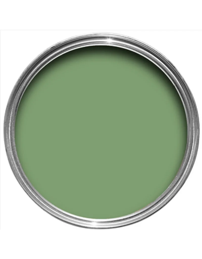 Vopsea pe bază de apă Farrow & Ball Folly Green 76 oferă un finisaj satinat cu 40% luciu, rezistent la pete și mucegai, sigur pentru copii și cu miros redus.